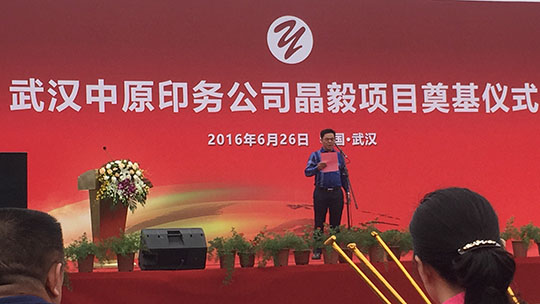 東西湖臺(tái)商投資區(qū)主任代表東西區(qū)各級(jí)領(lǐng)導(dǎo)發(fā)表重要講話,對(duì)武漢中原印務(wù)公司晶毅項(xiàng)目在此舉行奠基表示最衷心的祝賀和寄予深切的厚望!