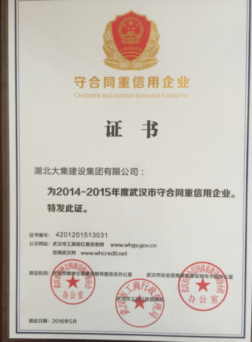 2016年7月21日上午,武漢市工商行政管理局委托蔡甸區(qū)工商管理局領(lǐng)導(dǎo)向湖北大集建設(shè)集團(tuán)有限公司董事長(zhǎng)徐濤頒發(fā)2014-2015年度“守合同重信用企業(yè)”榮譽(yù)證書,我公司已連續(xù)十二年榮獲此項(xiàng)殊榮!