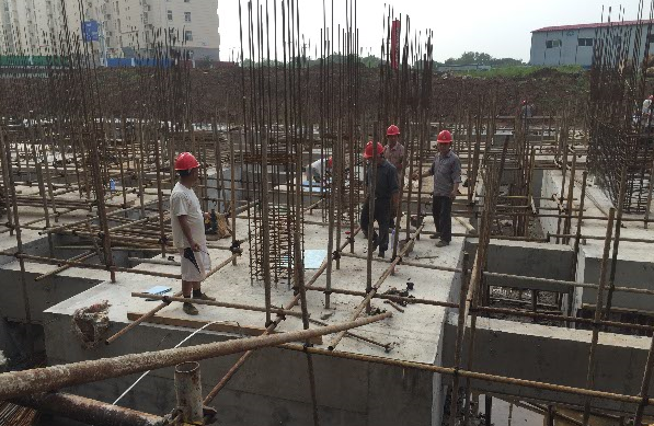 現(xiàn)場指揮部總指揮謝總工帶我們參觀了現(xiàn)場并大概介紹了各個棟號施工進(jìn)度等方面的情況。我們首先進(jìn)入16#樓施工現(xiàn)場,該棟號的項目經(jīng)理徐斌親自現(xiàn)場督促,施工現(xiàn)場緊鑼密鼓的進(jìn)行基礎(chǔ)承臺柱墻的鋼筋綁扎工作。剛剛完成的現(xiàn)澆混凝土承臺及承臺梁整體觀感好,整潔干凈、規(guī)范美觀。據(jù)謝總工介紹施工人員在混凝土澆筑時,先攤平振搗密實(shí),然后用抹子抹平,緊接著再用掃帚在已抹好的面層上輕輕掃一遍,再用薄膜覆蓋住才能達(dá)到好的效果。承臺上正在綁扎鋼筋的墻柱,每個樣板上都張貼著相應(yīng)的構(gòu)件尺寸及鋼筋信息,便于檢查核對和施工操作,體現(xiàn)出該工程現(xiàn)場施工人員嚴(yán)謹(jǐn)認(rèn)真的工作態(tài)度。