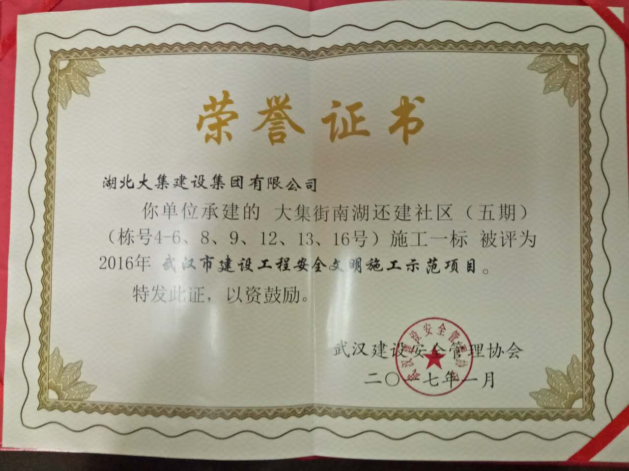 南湖五期項(xiàng)目繼4號(hào)樓、5號(hào)樓、6號(hào)樓,8號(hào)樓,9號(hào)樓、13號(hào)樓被上級(jí)監(jiān)管部門評(píng)定為“結(jié)構(gòu)優(yōu)質(zhì)“后,3月份項(xiàng)目部又獲得“湖北省優(yōu)秀建筑工地農(nóng)民工業(yè)余學(xué)?!睒s譽(yù)稱號(hào),4月12日,南湖五期4號(hào)樓、5號(hào)樓、8號(hào)樓、9號(hào)樓、12號(hào)樓、13號(hào)樓、16號(hào)樓再次被武漢建設(shè)安全管理協(xié)會(huì)評(píng)為"武漢市建筑工程安全文明施工示范項(xiàng)目",為湖北大集建設(shè)集團(tuán)再贏回一座黃鶴杯!
