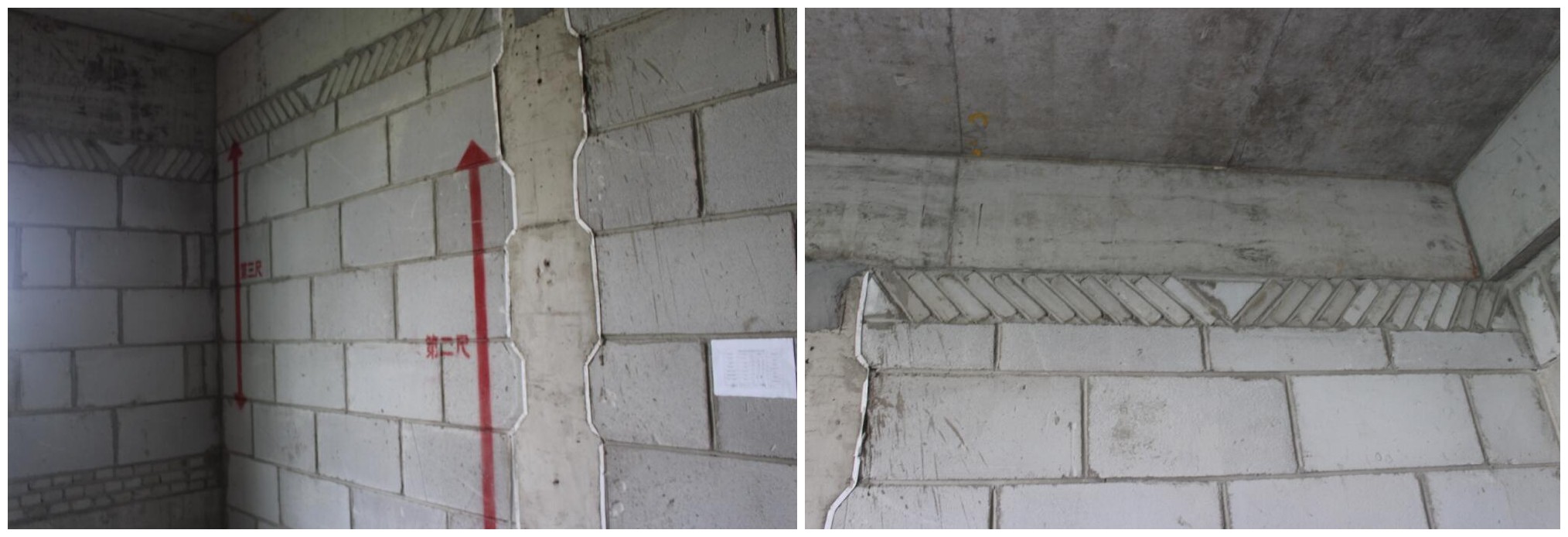 磚砌體及二次結(jié)構(gòu):1、灰縫均勻、密實(shí)、光滑;2、馬牙槎呈45度,邊口粘貼雙面膠,且二次結(jié)構(gòu)混凝土結(jié)口密實(shí),無(wú)蜂窩麻面,無(wú)漏漿現(xiàn)象;3、頂部斜砌體灰縫密實(shí),角度合乎規(guī)范要求(45度-60度);斜砌體交接處用三角砌體砌筑,使結(jié)構(gòu)穩(wěn)定,起到防裂作用。4、墻體垂直、平整度合規(guī),排版放樣合規(guī);