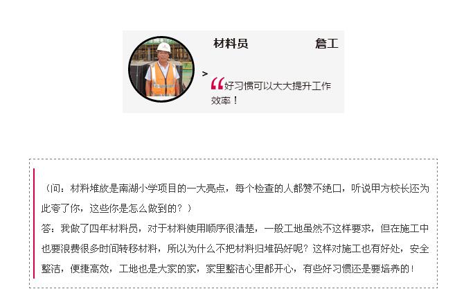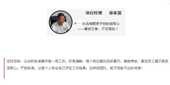 在7月份集團(tuán)各施工項(xiàng)目的績效考核評(píng)結(jié)果中,南湖小學(xué)項(xiàng)目以90分的高分榮獲第一名的好成績!項(xiàng)目績效考評(píng)嚴(yán)格復(fù)雜,涉及質(zhì)量、安全、資料、管理等方方面面,能取得這樣的成績實(shí)屬不易,問起項(xiàng)目經(jīng)理徐家富項(xiàng)目取得高分的秘籍,他笑著說,讓每個(gè)人都有一顆獅子般的進(jìn)取心,勇做王者,不甘落后,一切都能迎刃而解!近期,我們深入項(xiàng)目學(xué)習(xí)才發(fā)現(xiàn),成功絕對(duì)不是偶然,不僅項(xiàng)目經(jīng)理擁有一顆獅子般的雄心,項(xiàng)目中的每一個(gè)人都有一顆拼搏進(jìn)取,不甘落后的心,使得他們對(duì)每一個(gè)細(xì)節(jié)的管理都嚴(yán)格按照標(biāo)準(zhǔn),精益求精,方才成就今日的累累碩果!