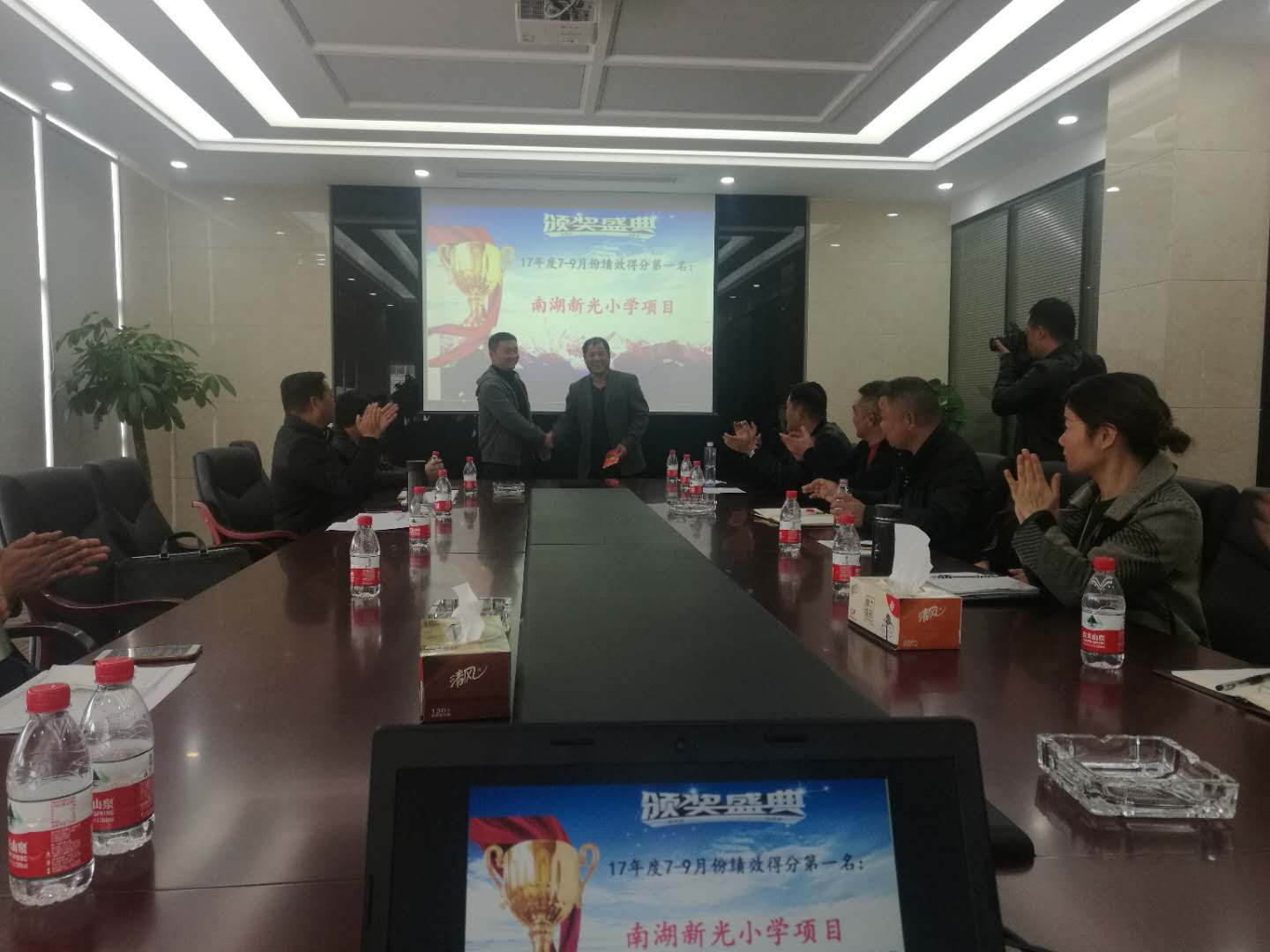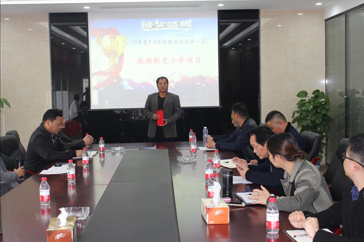 會議開始,由人事行政部公布了上季度績效考評中的冠軍項目——南湖(新光)小學項目,并由董事長徐濤向冠軍項目頒發(fā)10000元獎金!