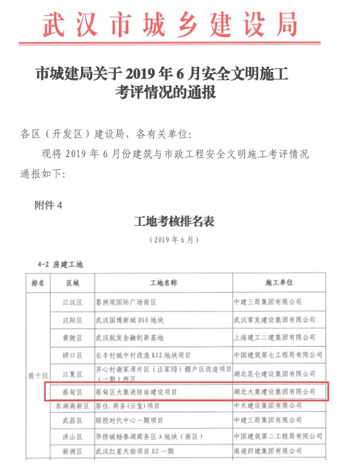 近日,武漢市城鄉(xiāng)建設(shè)局對2019年6月安全文明施工考評情況進(jìn)行通報。在全市被抽查的372個房建工地中,由湖北大集建設(shè)集團(tuán)承建的大集消防站工程表現(xiàn)突出,得分排名第六位,并受到蔡甸區(qū)建管站的表揚與好評。