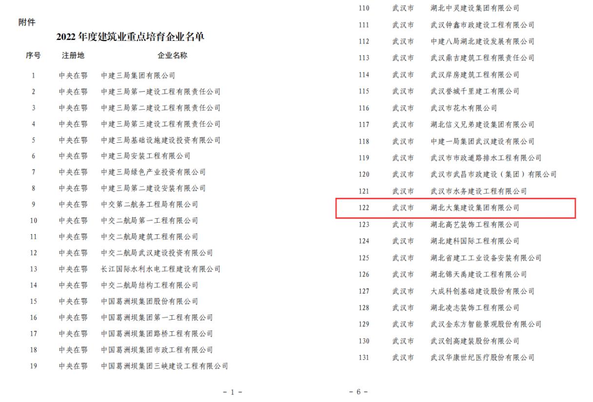 9月20日,湖北省住房和城鄉(xiāng)建設(shè)廳網(wǎng)正式公布湖北省2022年度建筑業(yè)重點(diǎn)培育企業(yè)名單,湖北大集建設(shè)集團(tuán)成功入選!