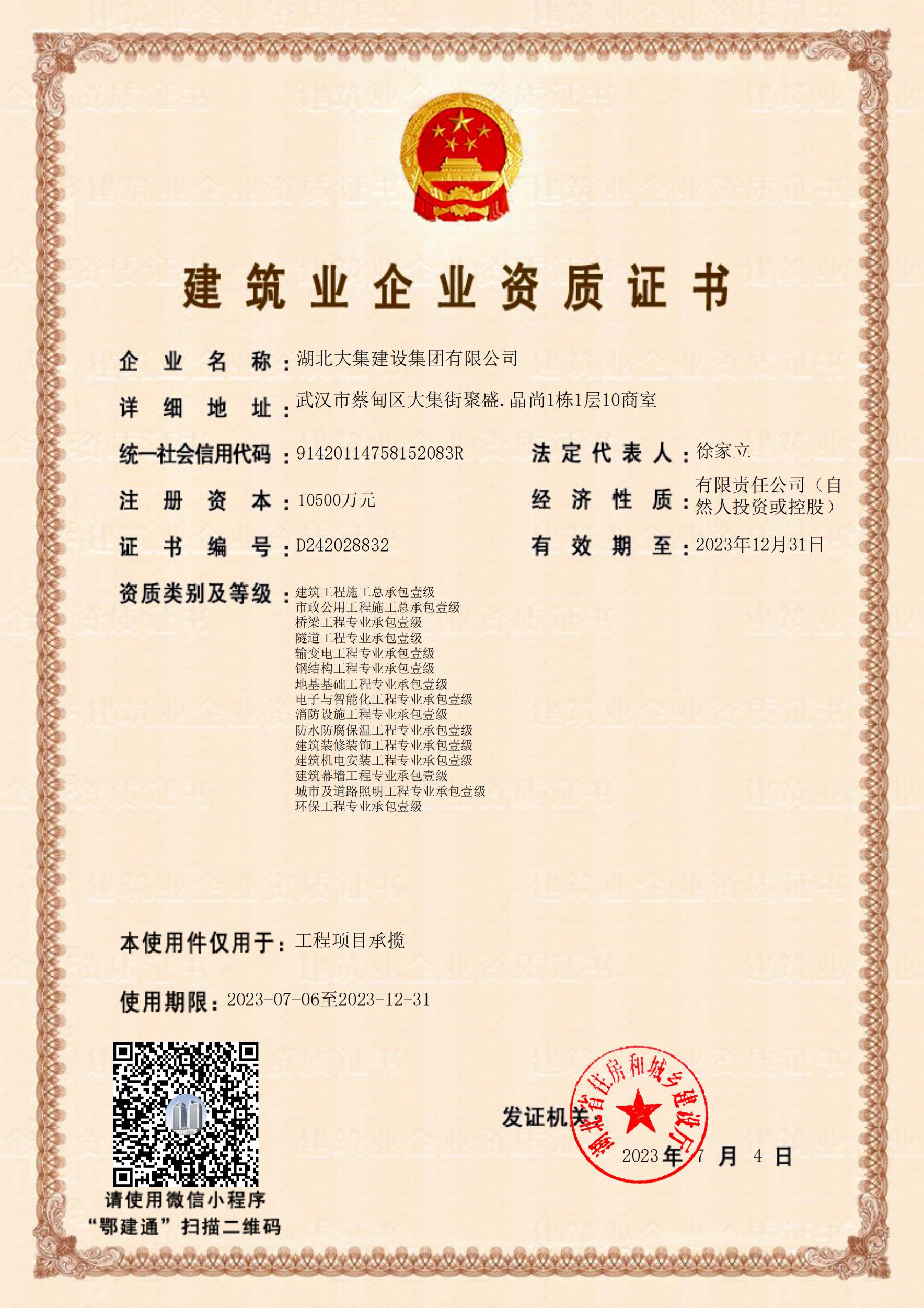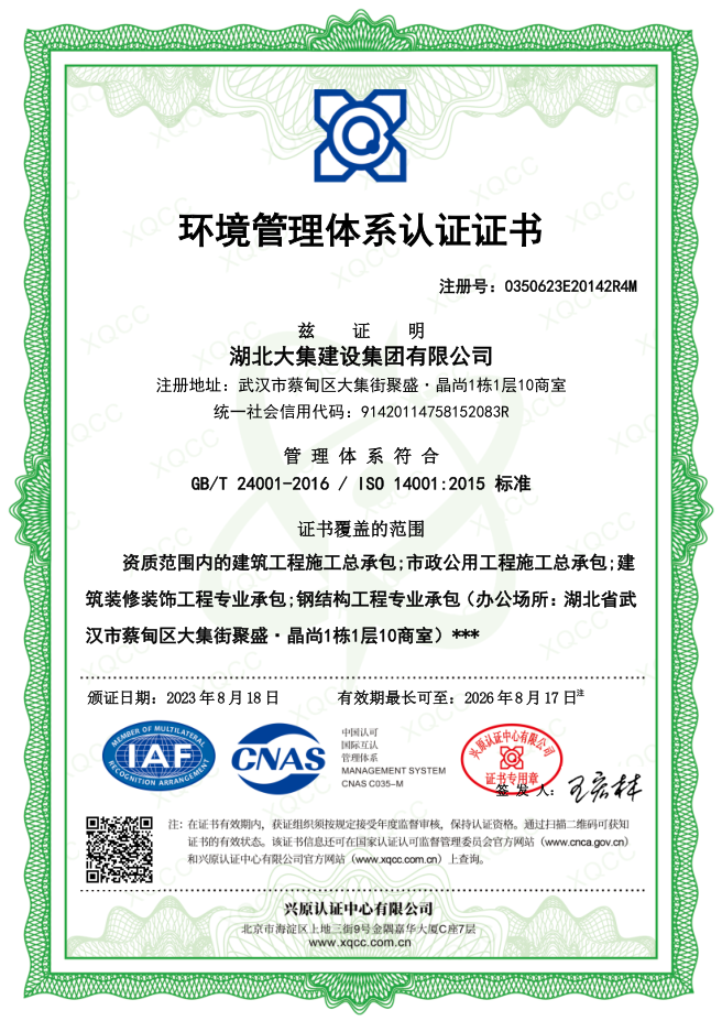 湖北大集建設(shè)集團(tuán)有限公司成立于1990年,注冊資本10500萬元,是武漢市蔡甸區(qū)本土建筑行業(yè)的龍頭企業(yè),在行業(yè)內(nèi)具有一定的品牌影響力。擁有建筑工程施工總承包一級、市政公用工程施工總承包一級、橋梁工程專業(yè)承包一級、隧道工程專業(yè)承包一級、輸變電工程專業(yè)承包一級、鋼結(jié)構(gòu)工程專業(yè)承包一級、地基基礎(chǔ)工程專業(yè)承包一級、電子與智能化工程專業(yè)承包一級、建筑裝修裝飾工程專業(yè)承包一級等多項資質(zhì)?,F(xiàn)已形成“建筑施工、園林綠化、文化旅游、房地產(chǎn)開發(fā)與物業(yè)管理”四大產(chǎn)業(yè)格局,并通過了行業(yè)和國家質(zhì)量管理體系、環(huán)境管理體系和職業(yè)健康安全管理體系認(rèn)證,三大安全管理體系日臻完善,是一家綜合力較強(qiáng)的綜合性建筑施工企業(yè)。