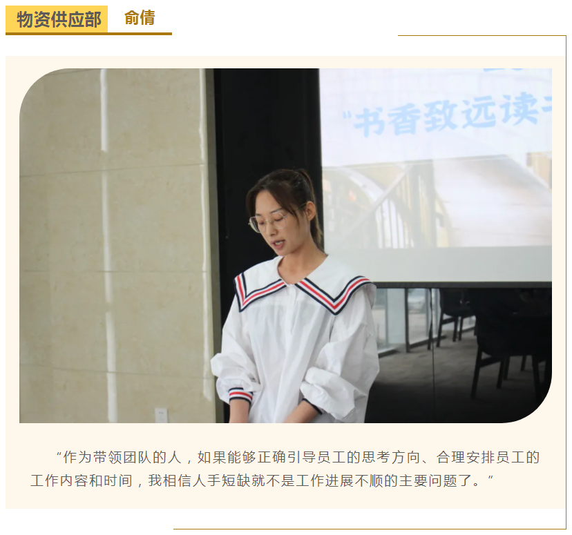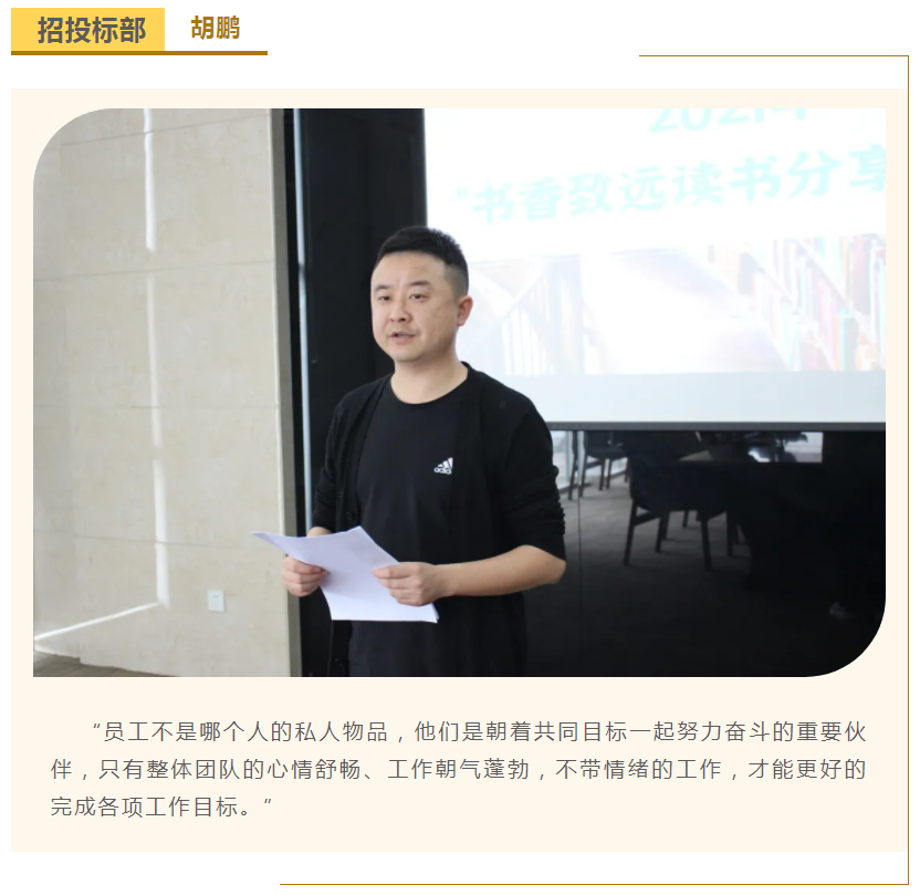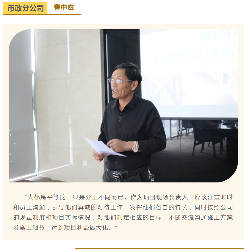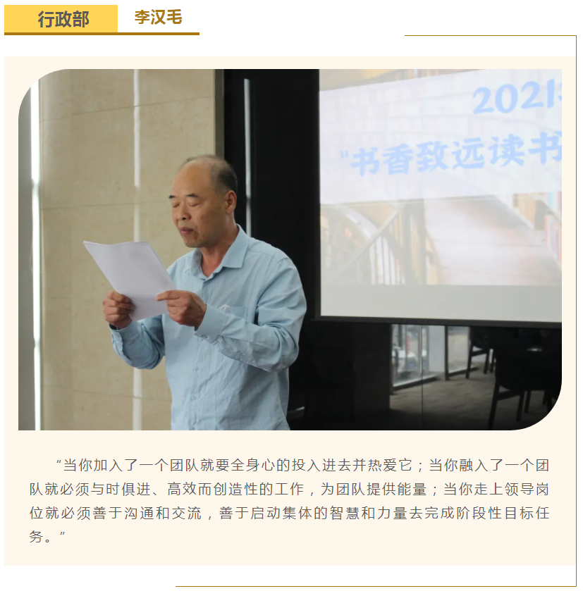 此次中高層領(lǐng)導(dǎo)共讀并分享的書籍是《麥肯錫團隊管理法》,集團公司七位部門負責(zé)人依次上臺,結(jié)合各自的實際工作、管理經(jīng)驗等,對書中的觀點進行闡述與分析。在思想交流碰撞中,各位部門負責(zé)人進一步加深了對團隊管理的認識,反思了自己在部門管理中存在的問題,了解了更多的管理細節(jié),學(xué)習(xí)了更有效的管理方法,為今后更好地完成日常管理工作打下了堅實的基礎(chǔ)。