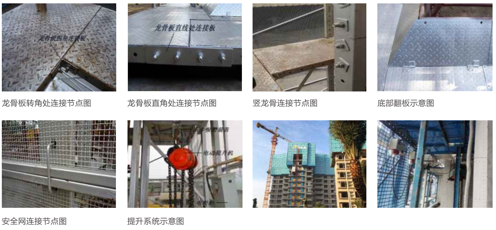 搭設(shè)平臺(tái)架并做水平調(diào)整→鋪設(shè)龍骨板→安裝下節(jié)導(dǎo)軌、豎龍骨、輔助豎龍骨→加輔助支撐桿及斜拉桿→水平鋼性拉結(jié)→安裝第二道龍骨板→安裝第一道安全立網(wǎng)→安裝第一道附墻件并卸荷→安裝中節(jié)導(dǎo)軌、豎龍骨、輔助豎龍骨→連續(xù)組拼架體直到安裝完2層各組架為止→連續(xù)組拼架體直到安裝完3層各組架為止→連續(xù)組拼架體直到安裝完4層各組架為止→鋪設(shè)電源線→安裝提升設(shè)備(進(jìn)入運(yùn)行階段)