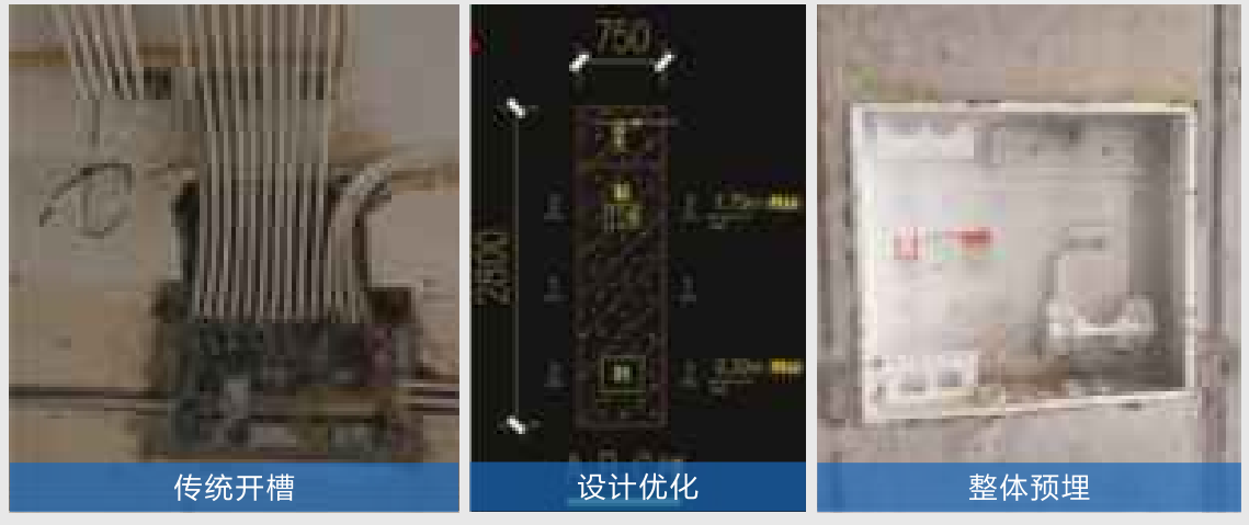 強(qiáng)弱電箱原圖紙?jiān)谄鲶w上開槽后埋線盒子,再進(jìn)行用砂漿修補(bǔ),這樣在工人施工過(guò)程中容易鑿斷或者震裂砌墻,后期修補(bǔ)因砂漿過(guò)厚也會(huì)引起面層開裂。為確保質(zhì)量,經(jīng)過(guò)設(shè)計(jì)優(yōu)化,增加構(gòu)造柱預(yù)埋線管及電箱,這樣不但解決開裂問(wèn)題,加快了施工進(jìn)度,大大消除了質(zhì)量風(fēng)險(xiǎn)。
